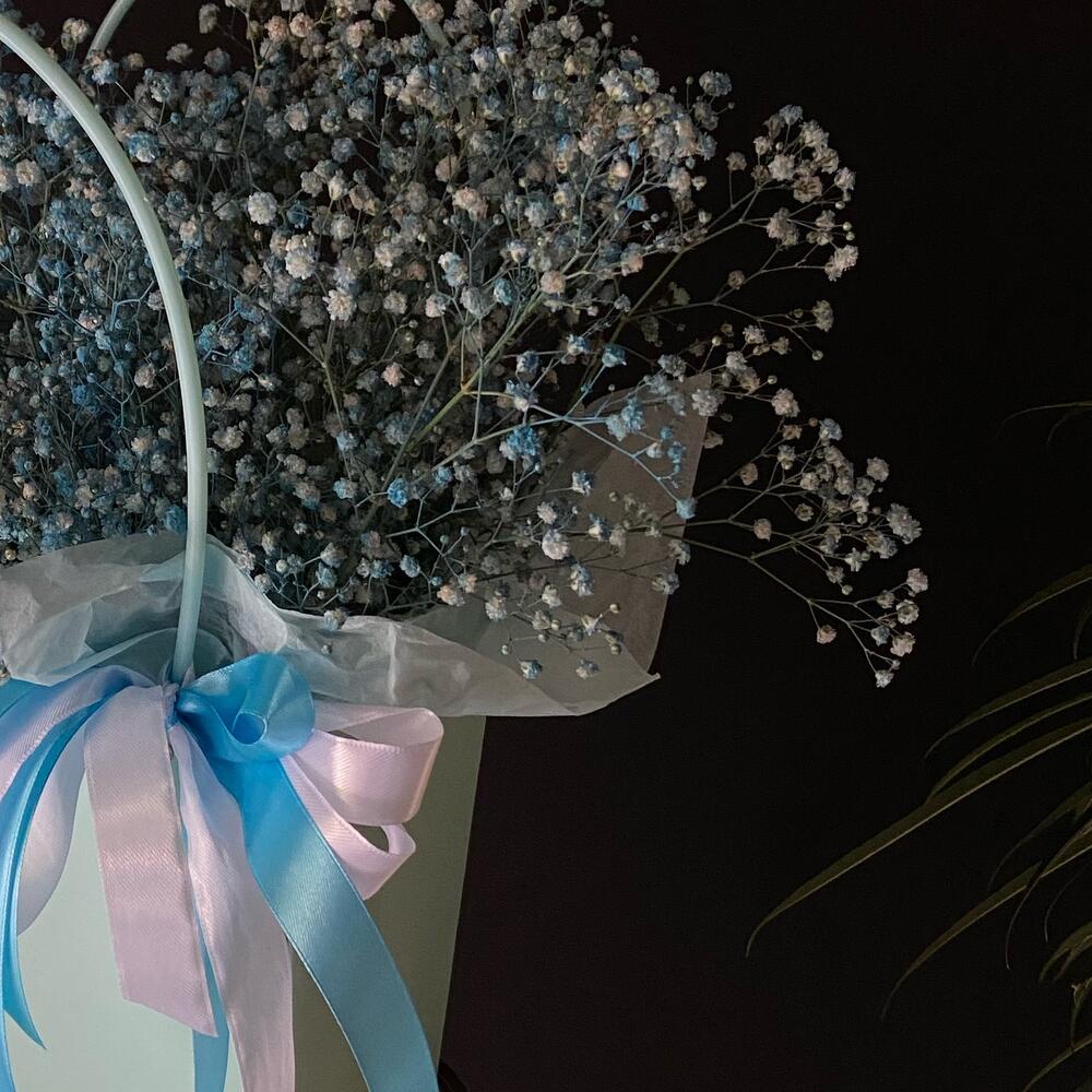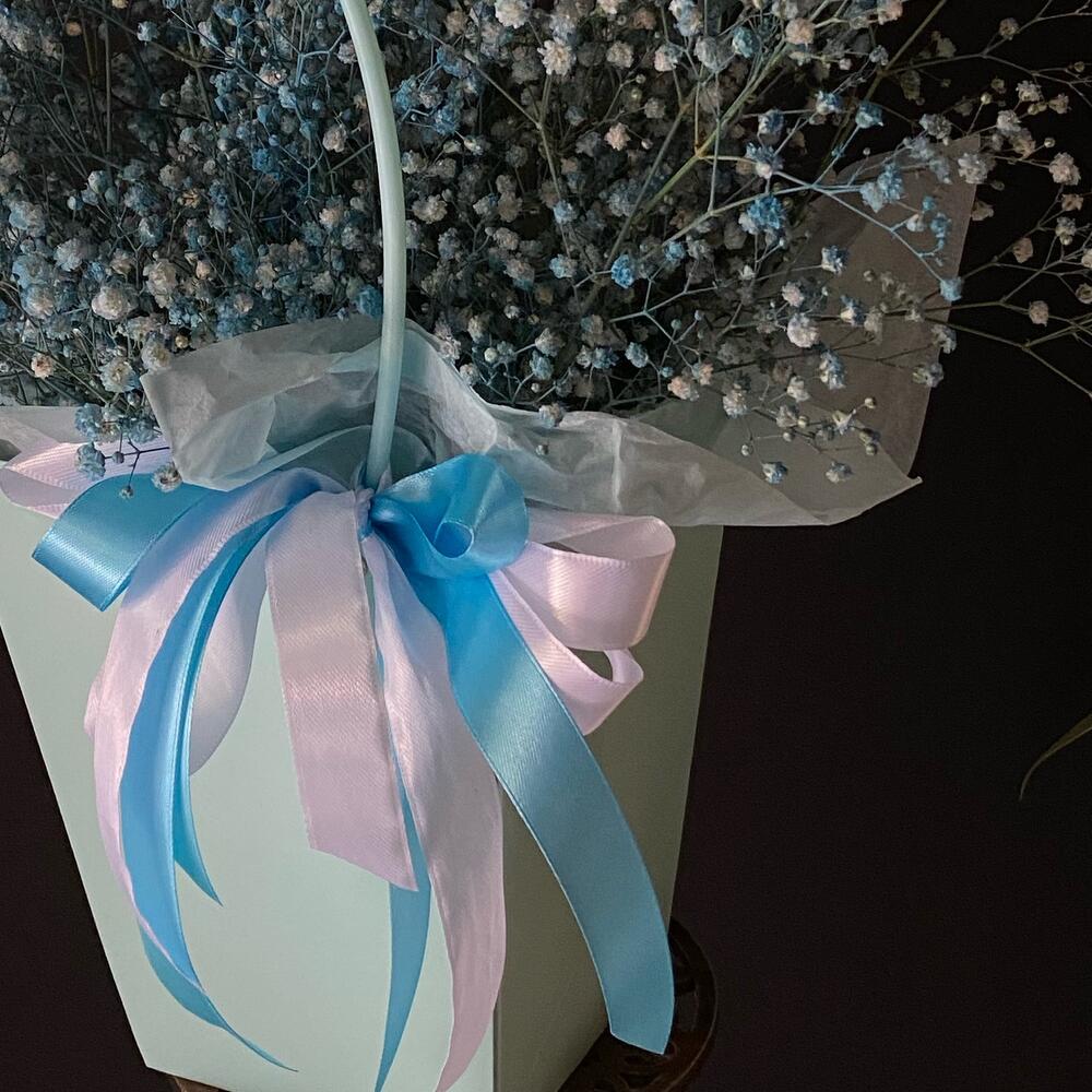 Гипсофила – 7 шт. Лента атласная – 1 шт. Тишью – 1 шт. Крафт пакет – 1 шт. Оазис флористический – 1 шт. Слюда упаковка – 3 шт.