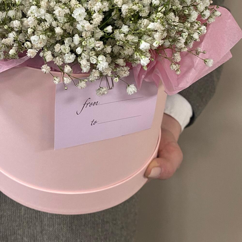 “Сиреневый туман” – композиция из гипсофилы в шляпной коробке