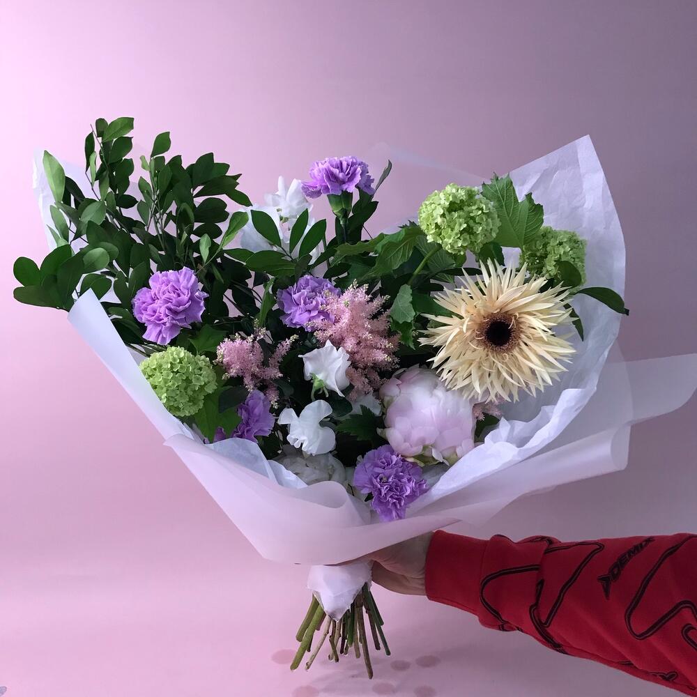 Оформление – 1 шт.Тишью – 3 шт.Пион Италия – 2 шт.Латирус – 2 шт.Диантус мун аква – 5 шт.Рускус Италия – 5 шт.Вибурнум – 2 шт.гербера томагавк – 1 шт.Астильба Европа – 3 шт.