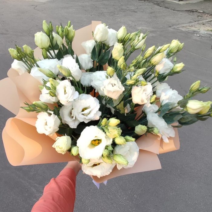 Красивый букет белоснежных эустом, оформленный во флористическую кальку светлых оттенков.