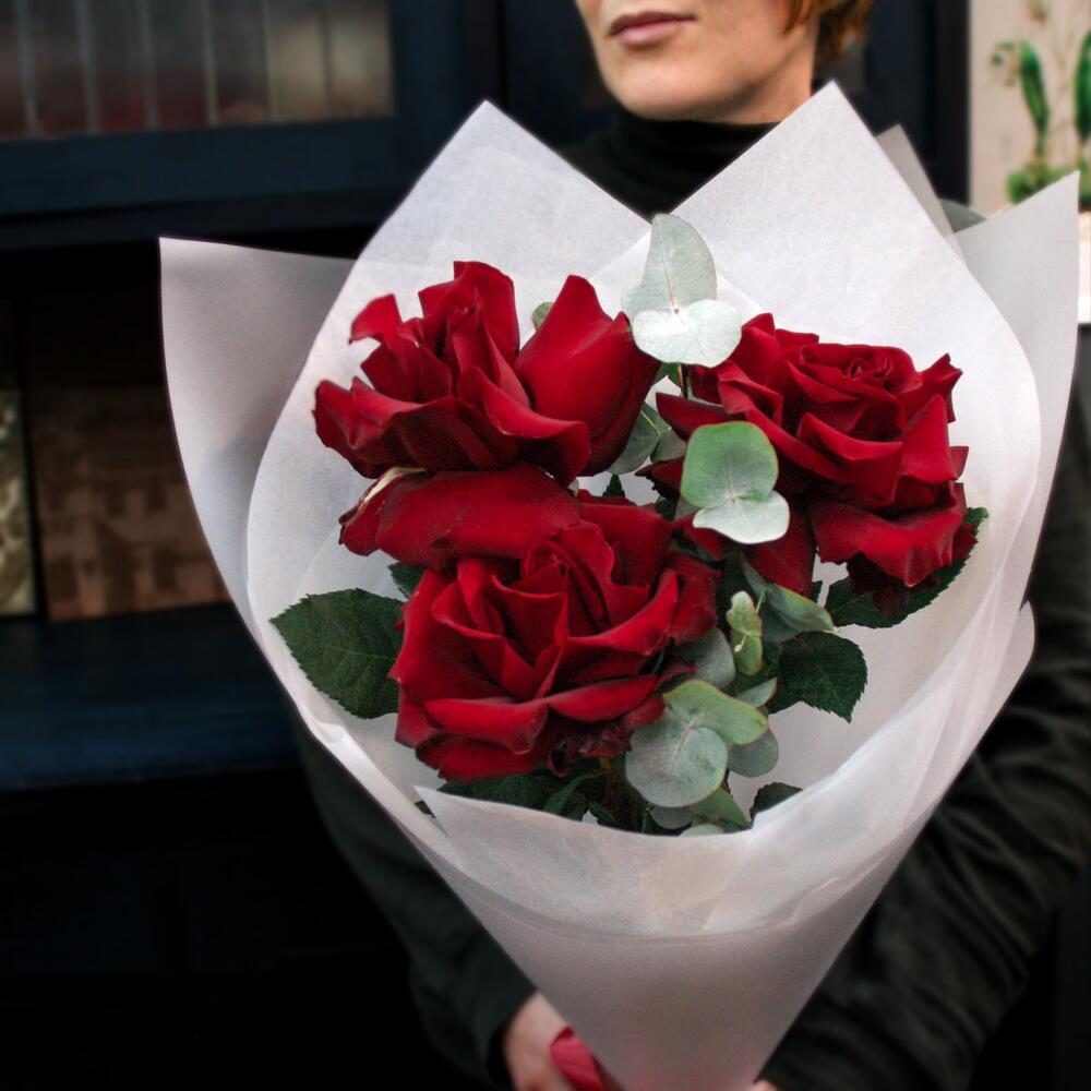 Эвкалипт – 1 шт.Тишью – 1 шт.Атласная лента – 2 шт.Французская роза – 3 шт.Матовая пленка – 2 шт.