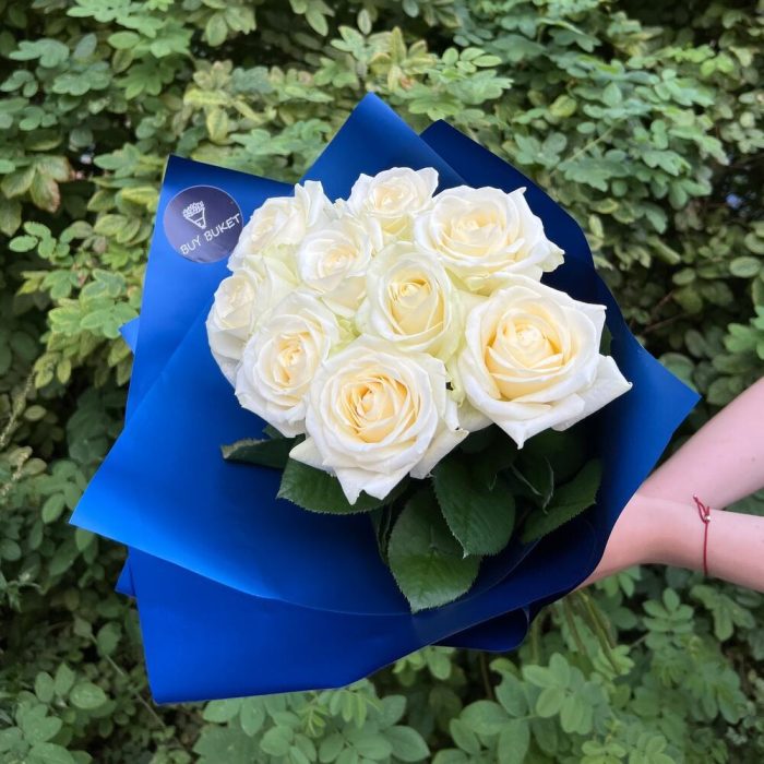 белая роза аваланж – 9 шт.пленка цветная – 2 шт.Лента атласная – 1 шт.