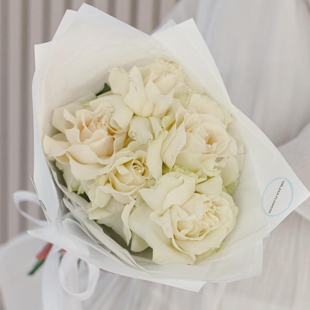 Роза французская – 5 шт.Тишью – 2 шт.Корейская пленка – 2 шт.Лента атласная – 1 шт.инструкция по уходу за цветами – 1 шт.Пакет крафтовый – 1 шт.