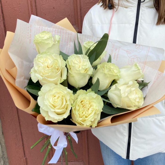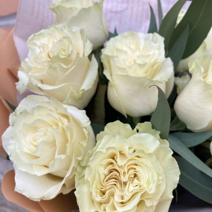 Роза Эквадор Мондиаль – 9 шт.Эвкалипт – 2 шт.Дизайнерская упаковка – 1 шт.подкормка для срезанных цветов – 1 шт.