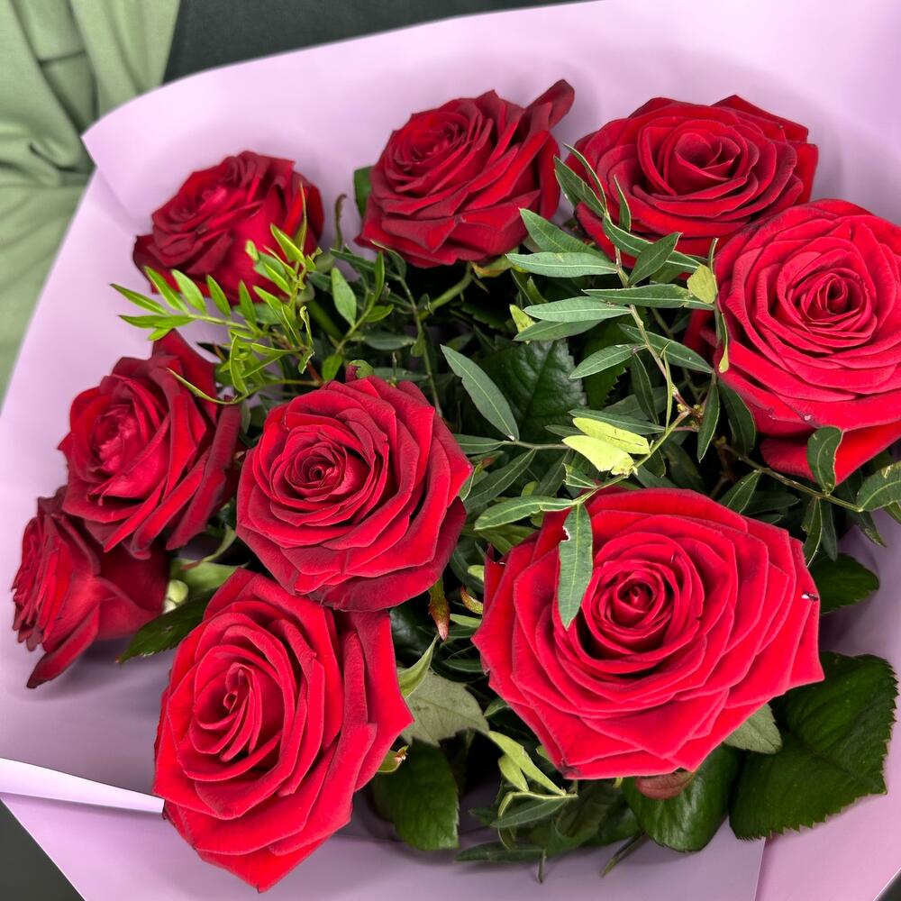 Лента атласная – 1 шт.Фисташка – 2 шт.Упаковка дизайнерская – 1 шт.Роза одноголовая россия – 9 шт.