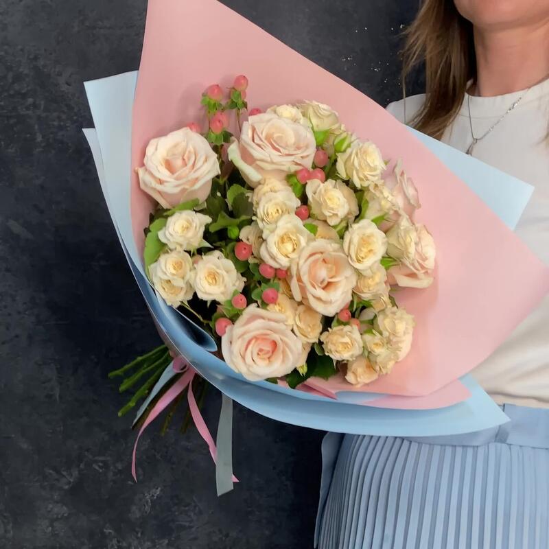 Лента атласная – 2 шт.Упаковка дизайнерская – 1 шт.Гиперикум розовый – 4 шт.Роза Талея 50 см – 7 шт.роза кустовая кремовая грация – 6 шт.