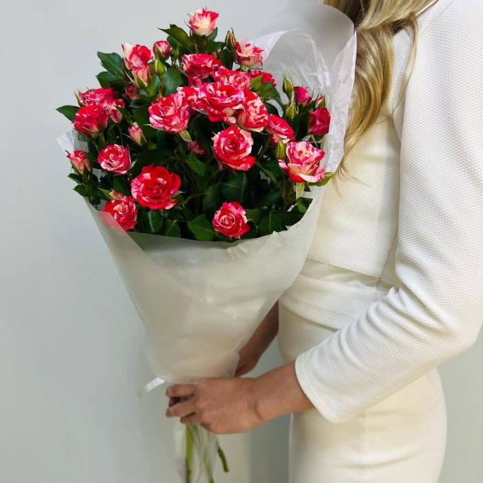 Кустовая роза – 5 шт.Лента атласная – 1 шт.Тишью – 2 шт.Матовая пленка – 2 шт.