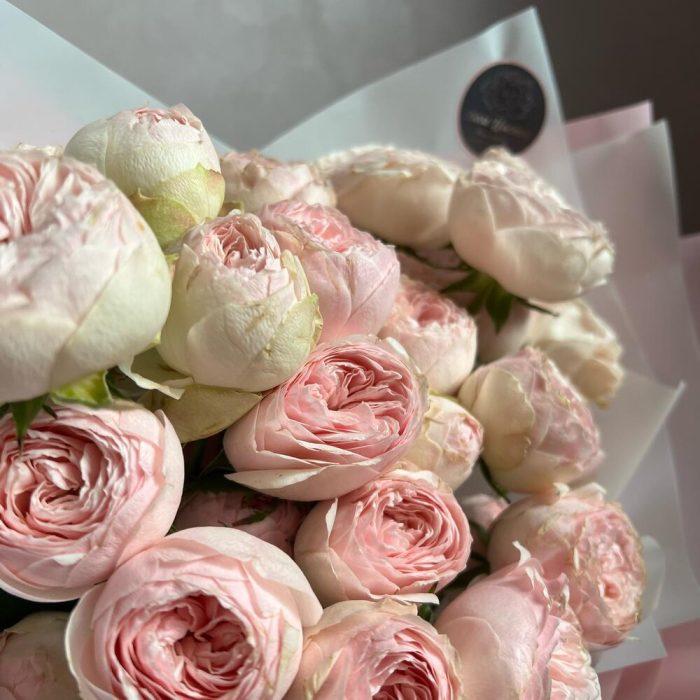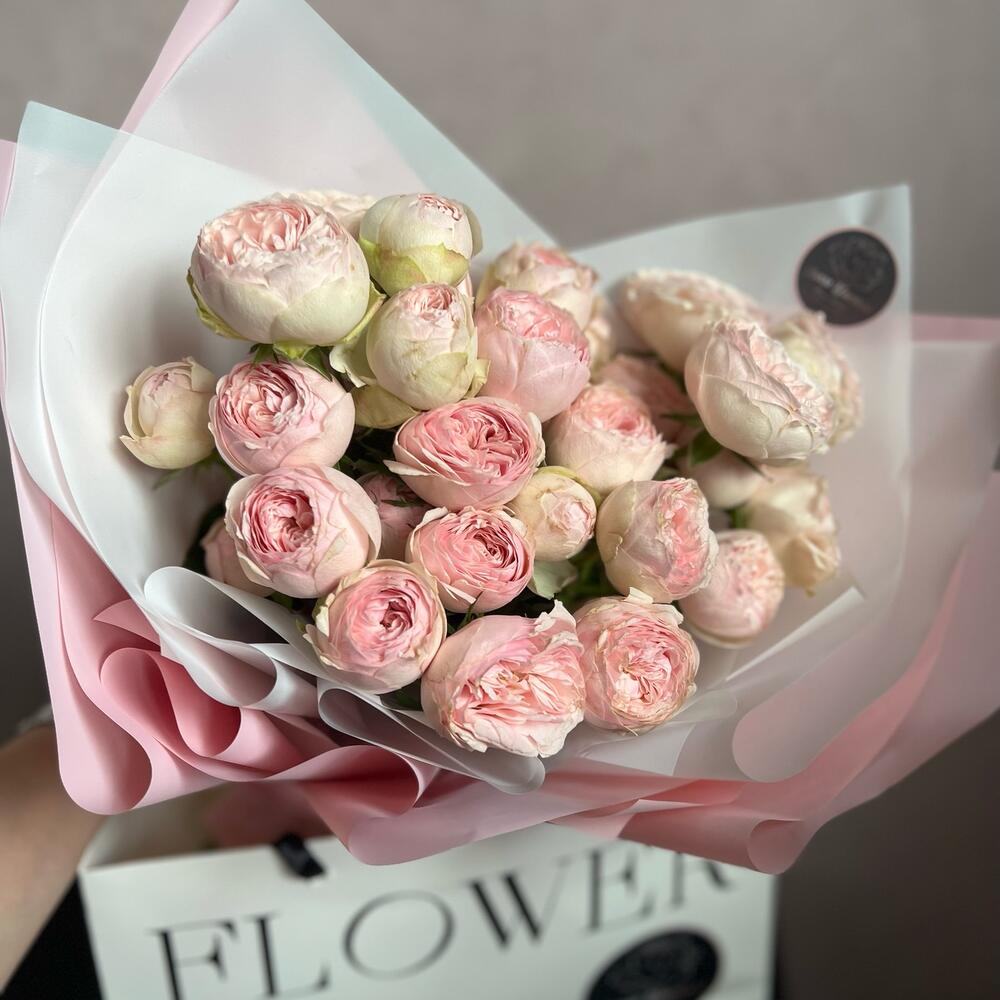 Атласная лента – 1 шт.декоративная упаковка – 1 шт.кустовая пионовидная роза менсфилд парк – 5 шт.