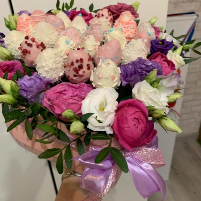 Роза Эквадор – 5 шт.Фисташка – 2 шт.Упаковка дизайнерская – 1 шт.Коробка сердце – 1 шт.Лизиантус микс – 10 шт.Клубника в шоколаде – 20 шт.