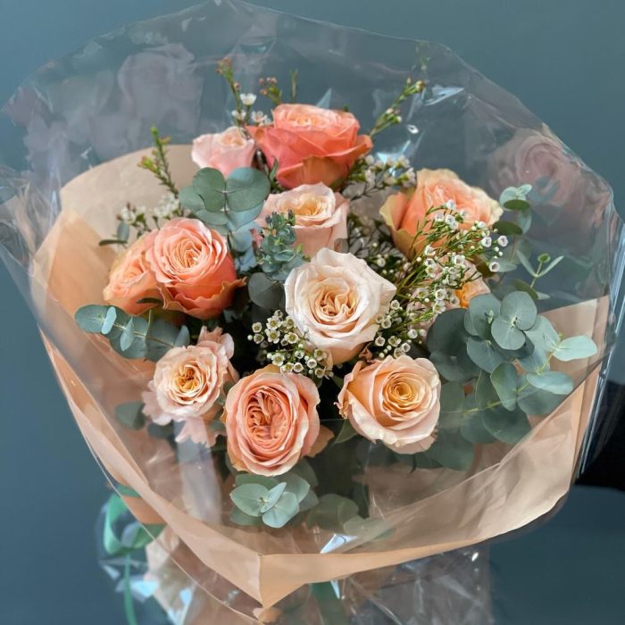 Ваксфлауэр – 2 шт.Лента – 1 шт.Эвкалипт – 2 шт.Роза одноголовая – 11 шт.Упаковка дизайнерская – 1 шт.