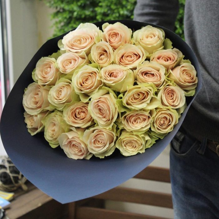 Роза Эквадор – 25 шт.Крафт дизайнерский – 1 шт.Лента атласная – 2 шт.Сердце – 1 шт.